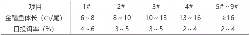 «根據網箱或存池金鲳魚規格及(ji)數(shu)量,參考投(tou)餌參考表中(zhong)推算投(tou)餌量,再根據天氣(qi)、水溫、水質(zhi)、金鲳魚攝食及(ji)健康狀況等(deng)予以(yi)适當調整。